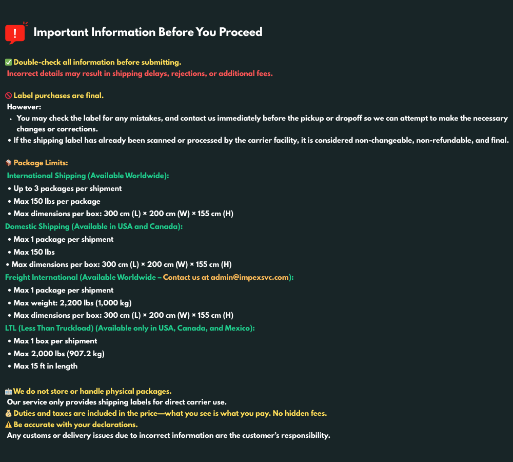 For LTL shipping, you can only send 1 pallet or skid per shipment. You must also state whether your shipment contains a Lithium battery. Lithium batteries are accepted, but they need special handling and processing.